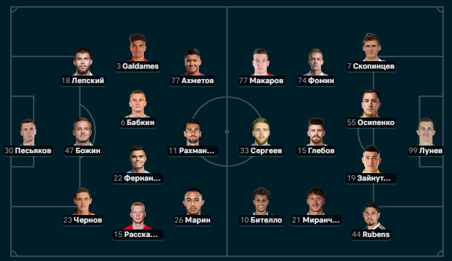 Лунев — Маричаль, Зайнутдинов, Осипенко, Рубенс — Глебов, Фомин, Миранчук — Бителло, Сергеев, Маухуб