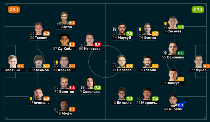 Овсянников — Ценов (Томпсон 62′), Касимов, Чичинадзе — Муфи (Гюрлюк 74′), Квеквескири (Камилов 62′), Болотов (Бубаня 86′), Ду Кейрос, Зотов — Савельев, Игнатьев (Косерик 62′)