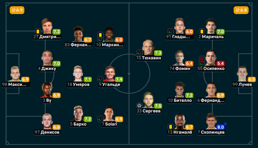 Максименко — Денисов, Джику, Ву, Дмитриев — Фернандеш, Умяров — Солари (Мартинс 74′), Барко, Маркиньос (Зобнин 60′) — Угальде (Гарсия 80′)