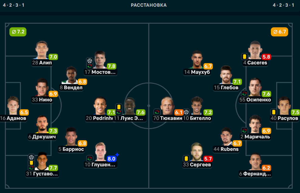 Расулов — Касерес, Маричаль, Осипенко (Скопинцев 46′), Фернандес — Маухуб, Бителло, Глебов, Рубенс — Сергеев, Тюкавин (Кутицкий 65′)